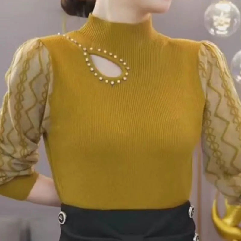 Women’s Korean Hollow-Out Sweater – Long Sleeve Half High Collar Knit Top | Autumn & Winter Casual Solid Spliced Pullover